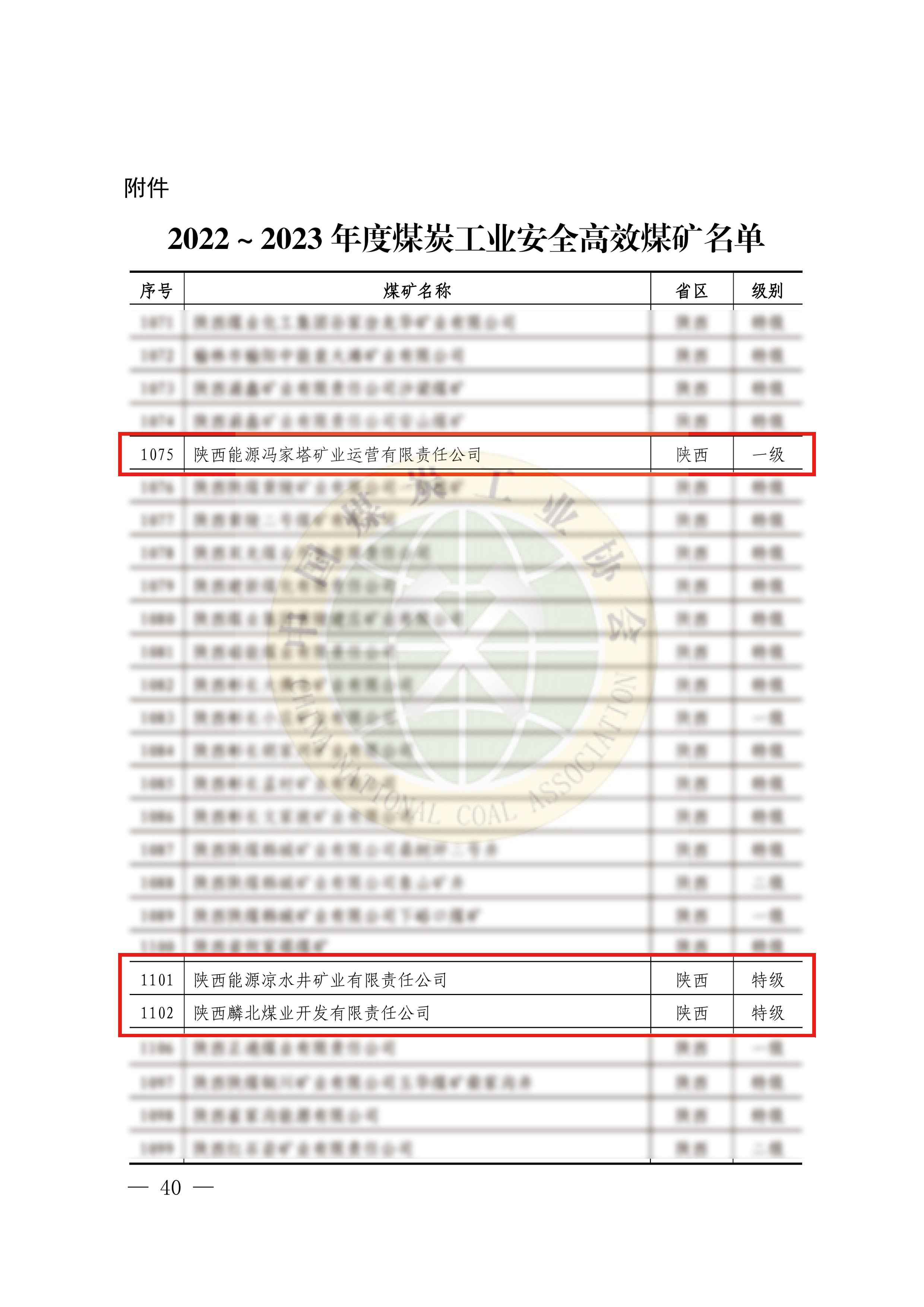 近日,中國煤炭工業(yè)協(xié)會(huì)命名的2022—2023年度煤炭工業(yè)安全高效煤礦名單中,陜西能源權(quán)屬的涼水井礦業(yè)、麟北煤業(yè)獲評(píng)安全高效特級(jí)煤礦,馮家塔運(yùn)營獲評(píng)安全高效一級(jí)煤礦。