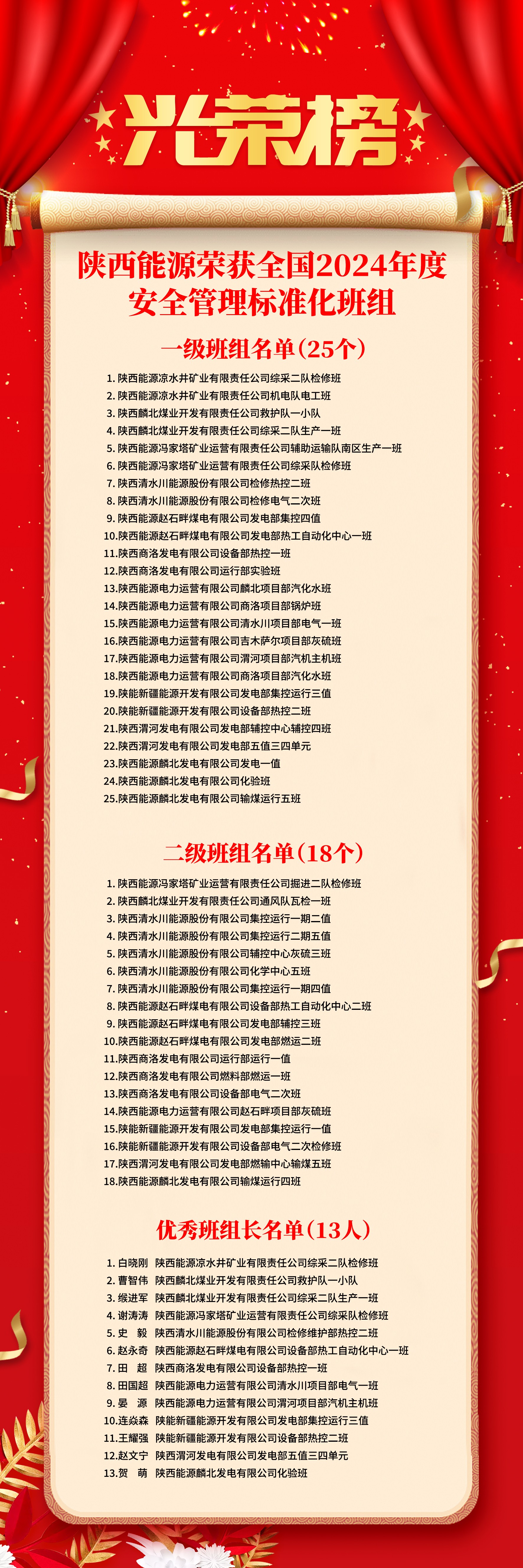 甲辰冬月,陜西能源在全國安全管理標準化班組創(chuàng)建活動中再創(chuàng)佳績。2024年12月20日,中國安全生產(chǎn)協(xié)會通報榮獲2024年度安全管理標準化班組一級班組370個、二級班組490個及優(yōu)秀班組長285人獲獎名單,其中陜西能源權屬企業(yè)有25個一級班組(在全國一級班組中占比6.8%)、有二級班組18個、有13個優(yōu)秀班組長(具體名單見后)。