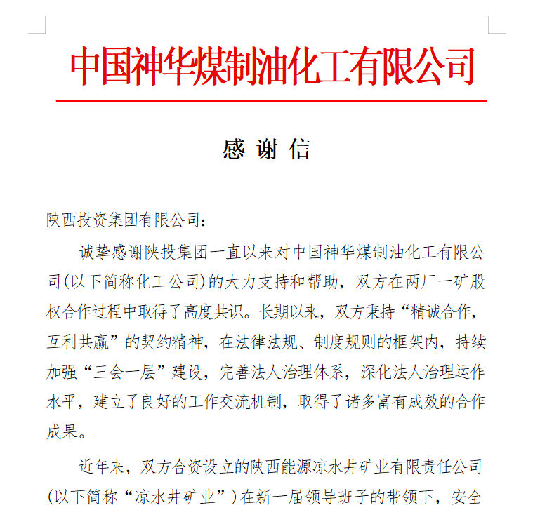 “誠(chéng)摯感謝陜投集團(tuán)一直以來(lái)對(duì)中國(guó)神華煤制油化工有限公司的大力支持和幫助……作為股東方,我們對(duì)涼水井礦業(yè)領(lǐng)導(dǎo)班子和廣大干部職工所做的突出貢獻(xiàn)予以充分肯定和高度贊賞,并向大家表示衷心的感謝!”近日,中國(guó)神華煤制油化工有限公司向集團(tuán)公司發(fā)來(lái)感謝信,對(duì)與集團(tuán)在兩廠一礦股方面的良好合作,對(duì)陜西能源權(quán)屬?zèng)鏊V業(yè)公司生產(chǎn)經(jīng)營(yíng)的突出成果表達(dá)誠(chéng)摯感謝。