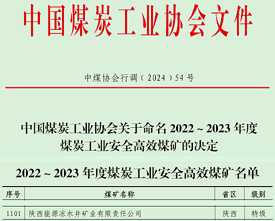 近日,中國煤炭工業(yè)協(xié)會(huì)公布“2022—2023年度全國煤炭工業(yè)安全高效煤礦”評審結(jié)果,涼水井礦業(yè)公司名列其中,且等級(jí)為特級(jí)。