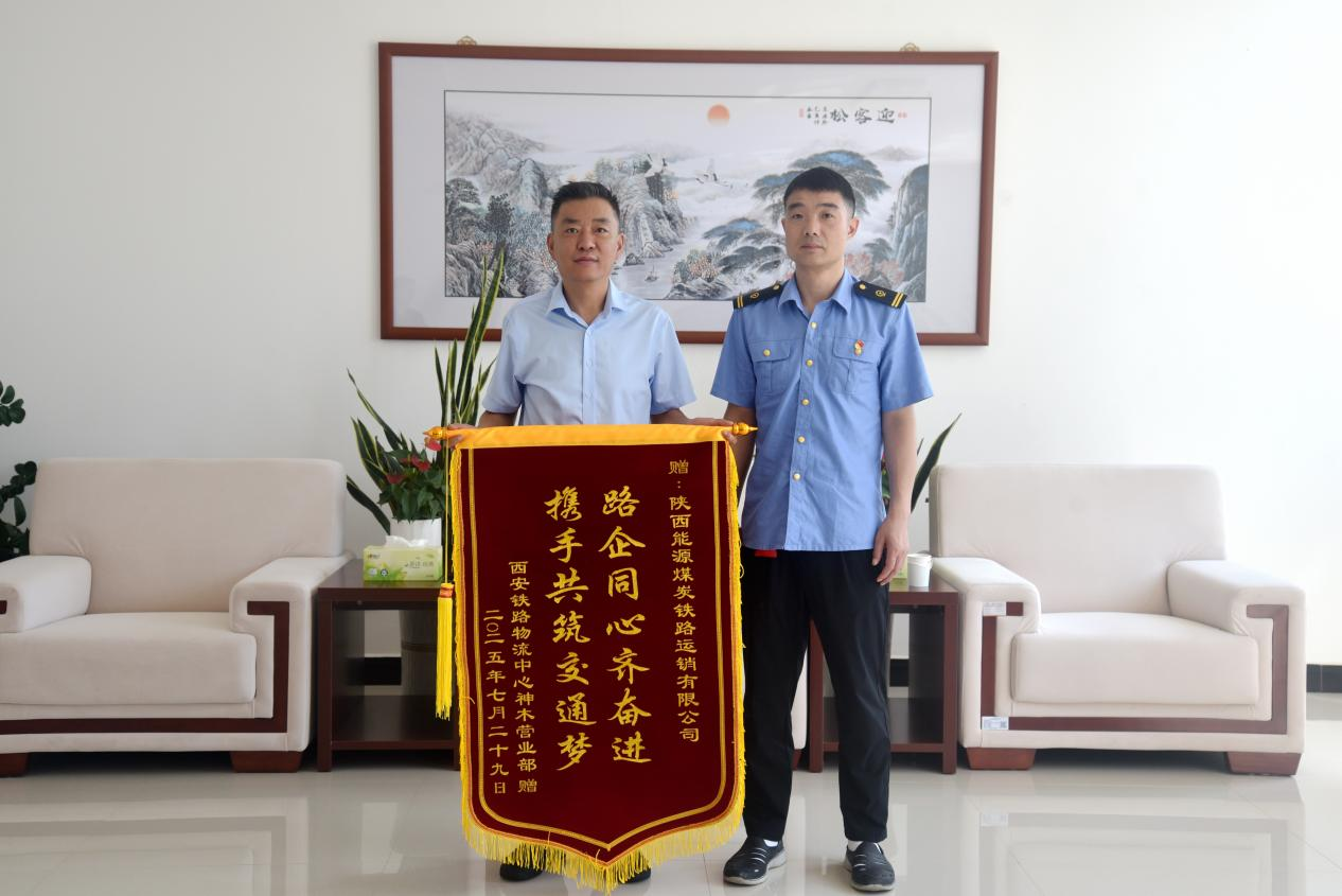 7月30日上午,西安鐵路物流中心神木營業(yè)部主任宋黎明將一面印有“路企同心齊奮進,攜手共筑交通夢”的錦旗鄭重交到鐵路運銷公司董事長手中,真摯感謝鐵路運銷公司在鐵路線路出現(xiàn)險情的危急關(guān)頭能夠鼎力馳援,助力鐵路線路高效搶通。